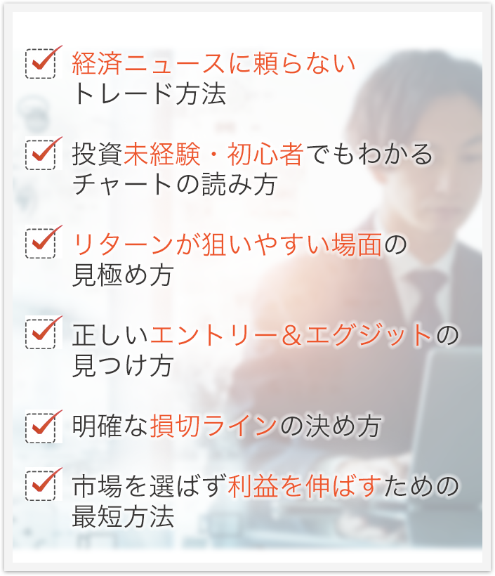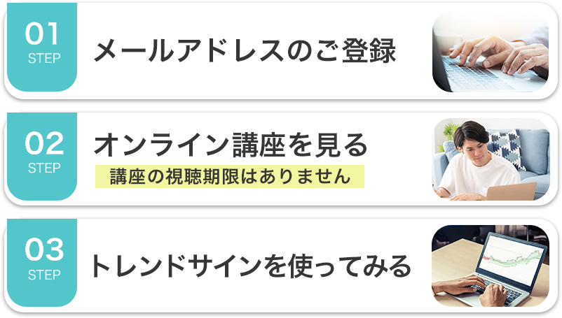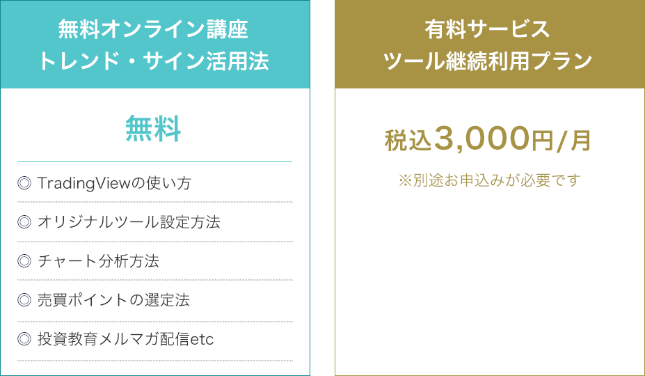 Q.投資は初心者ですが大丈夫でしょうか? A.はい、大丈夫です。当講座は投資未経験の方でもわかるように丁寧に解説しています。また、売買でお金を守りながら運用する手順もお伝えするので、安心してお試しください。 Q.ツールは30日を過ぎると自動的に有料になるのでしょうか? A.自動的に有料になることはございません。継続的なご利用をご希望の場合は「継続プラン」へのお申込み方法をメールでご案内させていただきますので、その際にお申込みをご検討ください。 Q.TradingViewで売買はできますか? A.TradingViewはチャート分析を行うためのツールとなり、実際に売買を行うには各証券会社で別途口座の開設が必要になります。当講座ではどの証券会社でもご利用いただけるので、すでにお持ちの口座があればそちらをご利用いただけます。 Q.TradingView以外のツールでも使えますか? A.TradingView専用で開発したオリジナルのチャート分析ツールとなるため、他のツールでは使用できません。なお、TradingViewは無料版でツールを使用できます。 Q.メールアドレスを登録したのですが、返信メールが届きません。 A.携帯アドレス(au,softbank,docomo,icloudなど)は、当社からのメールが届かない場合があります。ご登録は「gmail」または「Yahoo」アドレスをおすすめします。また、gmail、Yahooメールであっても「迷惑メールフォルダ」に入ってしまう可能性があります。メールが届いていない場合は「迷惑メールフォルダ」もあわせてご確認ください。携帯アドレスをお使いの方は【info@trade-labo.jp】からのメールの受信設定をONにした上で、お手数をおかけいたしますが再度ご登録をお試しください。 Q.パソコンを持っていません。スマホだけでもできますか? A.ツールはスマホでもご利用いただけます。ただ、当講座でお渡しする動画及びマニュアルはパソコン画面をもとに解説しており、スマホ画面とボタンの配置などが異なっている可能性があります点、あらかじめご了承ください。もし今後、投資を継続的に学ぶおつもりでしたら、パソコンがあるとより理解が深まりやすいので購入をおすすめします。 Q.無料講座の視聴期限はありますか? A.視聴期限はございませんので、ご自身のペースでご覧ください。また、当オンライン講座はパソコン・スマホどちらからでも視聴いただけますので、好きな場所でご覧いただけます。