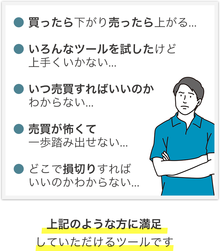 損切りラインを決めるときに 絶対間違ってはいけないのが、 「闇雲に決める」 ことです。 闇雲に損切りを設定すると、 損切り貧乏になる可能性が高まります。 この解決策は、自分にあった トレードスタイルで損切り基準を 決めておくことです。 しかし、投資は手法が多くあり、 超短期、短期、中期、長期… と損切りラインの決め方も変わります。 そこで、トレンドサイン独自の 損切りラインがサポートします。 この基準により、大損する危険を排除し、 売買に迷いがでることを防止させます。