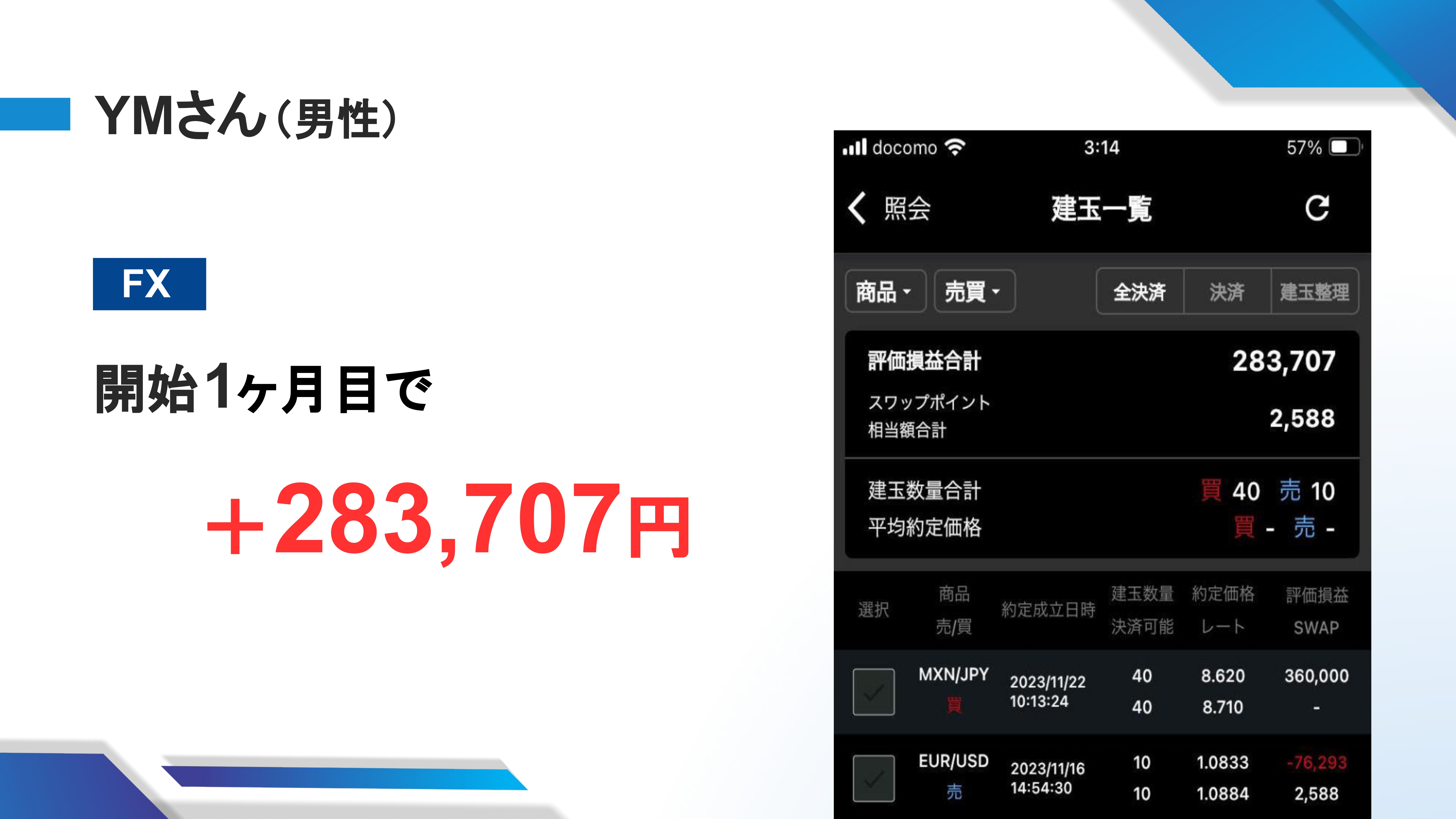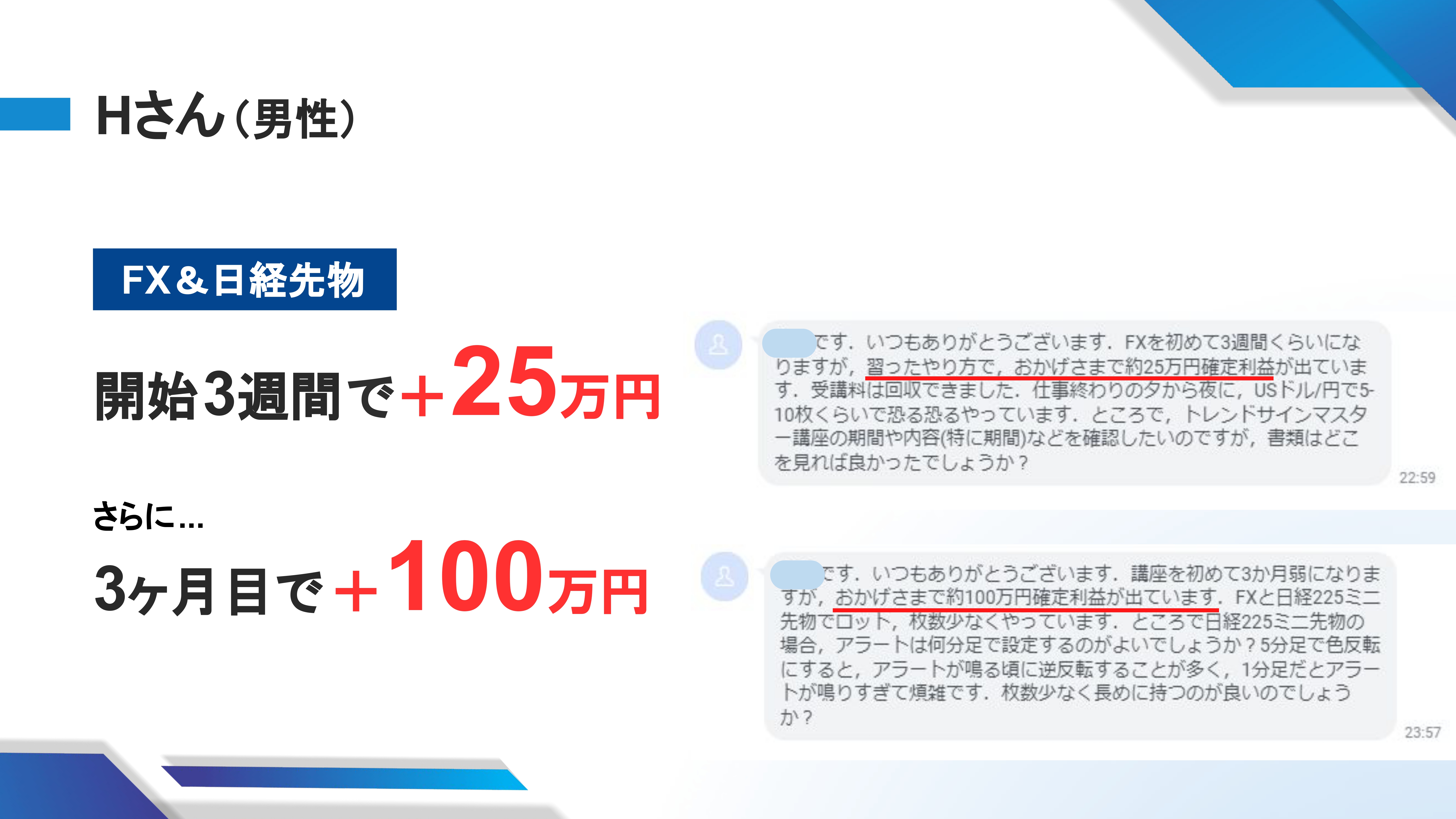 シンガポールで生まれ幼少期をシンガポールで過ごした後、日本へ移住。 慶應義塾大学への入学を機に起業を決意し、 個人で稼ぐ収入の柱を持つためビジネススクールとFXスクールを渡り歩く。 初めてのFXスクールで、150万円を払って勉強したが まったく成果が出せずトレードを断念。 その後も副業や投資の案件で失敗を繰り返し、 累計で850万円を失う。 失意の中出会った、とあるプロトレーダーから 資金管理やテクニカルの発想を根底から学び直し、 「トレードは何か隠された秘密のノウハウや聖杯が存在するのではない」 相場の原理原則に基づけば いくらでも利益になる手法は自由に作れると実感。 トレードに対する見方が180度変わり、 トレンドサインの原型となるインジケーターを自作することに成功。